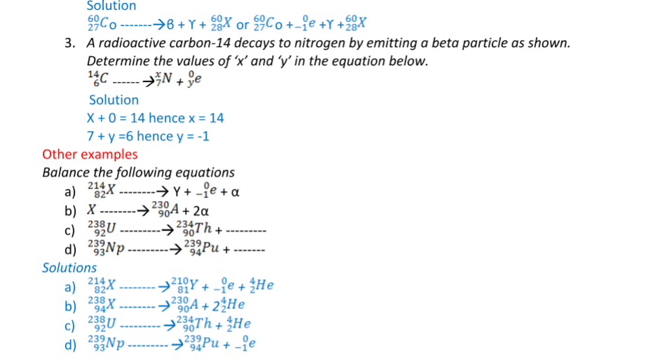 A neutron 'n' with no charge but with mass 1ᴜ, is written as , while an electron with a charge of -1 and negligible mass is written as . It is important to note that the principles of conservation apply in radioactive decay.