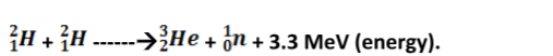 A fusion reaction releases energy at the rate of 3-23 MeV per fusion event i.e. two deuterium (heavy hydrogen) nuclei to form helium.